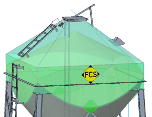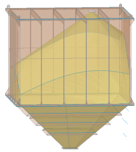 As is seen in the figure to the left, the right offset inlet location causes material to pile on the right side of the bin reducing the live volume. - At FCS, we utilize 3D modeling software combined with angle of repose of the bulk material plus the inlet location to create the actual usable volume of the bin. Without 3D modeling, it is nearly impossible to calculate usable volume of offset fill or special compartment shapes by hand. We strive to provide the most accurate capacity ratings so your bin holds what you need to make your project a success.
